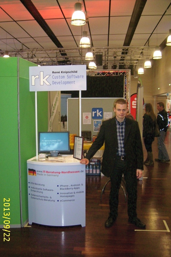 René Knipschild freute sich sehr über den Besuch durch Lothar Salokat (Werksleiter Continental Korbach) und Dr. Reinhard Kubat (Landrat) direkt zu Messebeginn beim offiziellen Rundgang. Auf der Regionalmesse stellte sich zum ersten Mal auch der seit Mitte 2013 bei René Knipschild beschäftigte Software-Entwickler, Danny Morabito, vor. Nachfolgend einige Fotos vom Stand, vergrößern durch Anklicken.